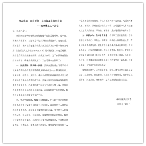 新年伊始,新型冠狀病毒疫情出現(xiàn)爆發(fā)之勢。疫情就是命令,防控就是責任。公司領導高度重視疫情發(fā)展趨勢,于1月30日召開林州重機疫情防控緊急會議,著手安排公司疫情防控工作。